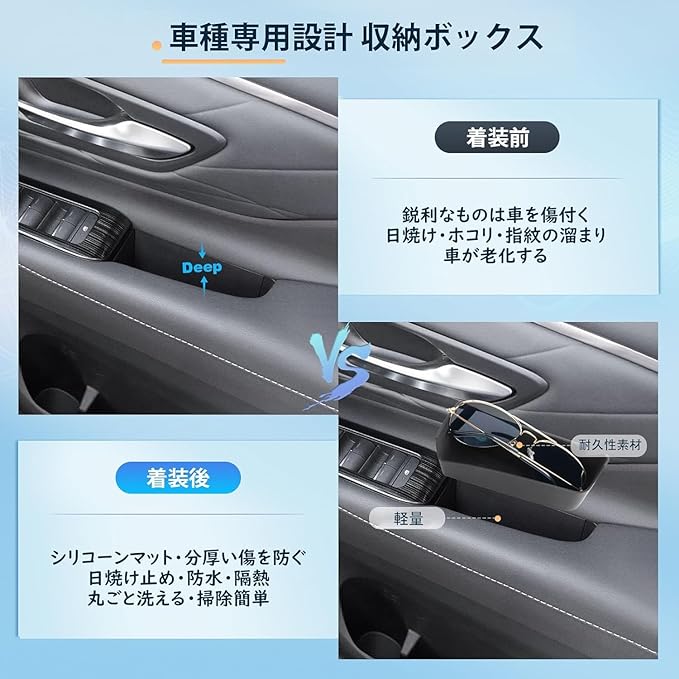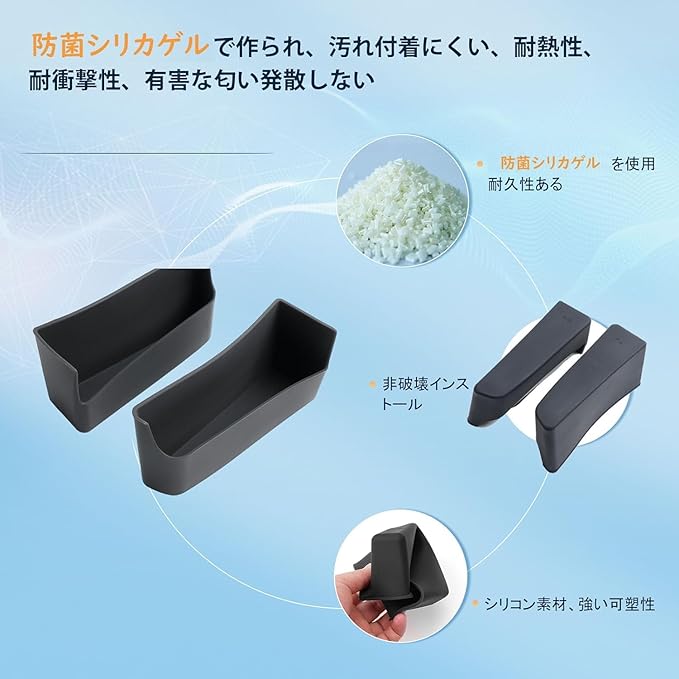 【防菌シリカゲル製 耐久性と耐衝撃性】耐久性と実用性の面では、このアルファードのドアハンドル収納ボックスは厳選された防菌シリコン素材で作られており、全身シリコン素材、ソフトな質感、高温耐性、車内の高温や低温によって変形せず、長時間使用しても形状が安定しています。同時にシリコン素材は耐化学薬剤にも優れており、洗剤で洗いても傷つきません、長く使用できます。 収納ボックスは丸ごと洗えるので、お手入れが簡単で便利、内部に汚れがあった場合でも水で簡単に除去できるので、車内を清潔に保つことができます。