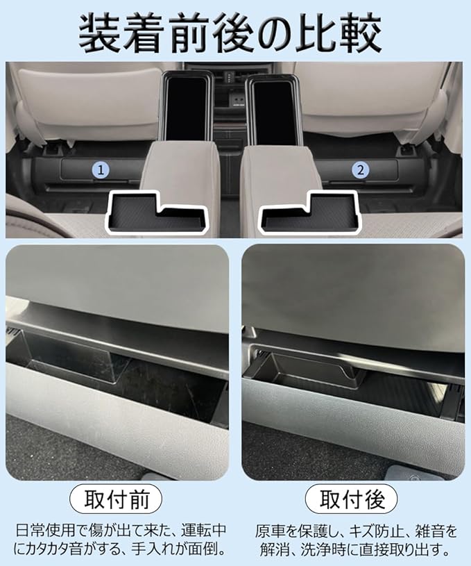 【収納性・便利】この ヴェルファイア 40系 シート下収納ボックス は スペースを有効活用して、様々な小物を綺麗に収納できます。また、ストライプのデザインにより摩擦が増加し、運転中の物の滑りを効果的に防ぎ、騒音を軽減します。運転席周りのスペースにきれいになります、気分良くドライブを楽しめます。