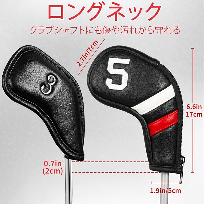 ゴルフアイアンカバー ファスナー開閉 ウェッジカバー ロングネック クラブヘッドカバー セット 10pcs(4-9,P,A,S,X) 合成皮革 黒い 赤い 白い