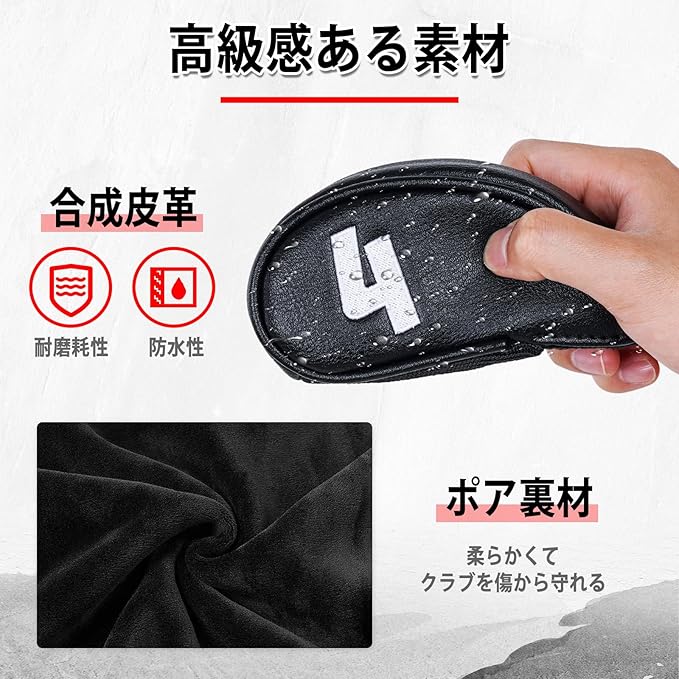 【高級感のある素材】表生地は高級感のある合成皮革(PUレザー)なので、耐磨耗性、防水性があります。裏生地はポリエステル製柔らかいボア素材になっていますので、大切なクラブヘッドを傷や汚れから守ります。