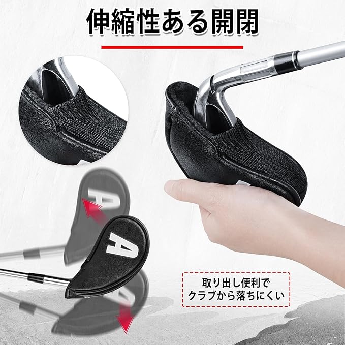 ゴルフアイアンカバー 伸縮性ある開閉 ウェッジカバー クラブヘッドカバー セット 9pcs(4-9,P,A,S) 正面と側面白い番号 黒い合成皮革 三片式