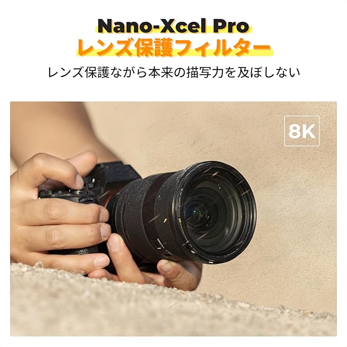 【Nano-Xcel Pro 保護フィルター】描写にも影響なくクリアに写るレンズの前玉の保護目的でプロテクターフィルターです。99.3%以上の高透過率で、画質を損なうことなく4K・8Kに対応できます。外装の新旧が混在しますが、中身は同一です。
