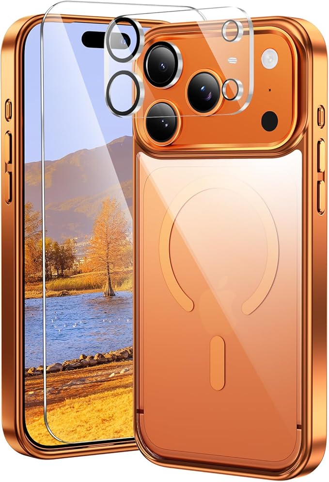 【4倍米軍MIL規格・MagSafe 対応・3 in 1】Gtsoho 軽量 薄型 iPhone 17 Pro Max ケース クリア スクリーンプロテクター & カメラレンズプロテクター付属 黄変防止 【金属感・四辺高級メッキ加工】【四角防摔設計】マグネット機能でワイヤレス 耐衝撃 いphone17pro max ケース (クリアオレンジ)