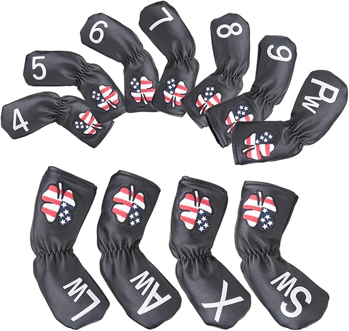 高級pu革 アイアンカバー クローバー usa 米国旗 11点セット 防水 4番~9番 AW PW SW X 番手付 黒