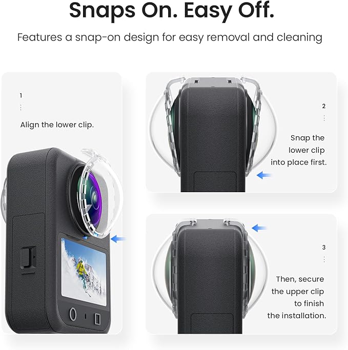 【簡単装着】前面レンズと背面レンズの保護レンズは別々に装着できます。どちらのレンズを取り付ける際も、クリップの位置を合わせて下から固定してください。レンズはいつでも取り外して内部の汚れを掃除できます。