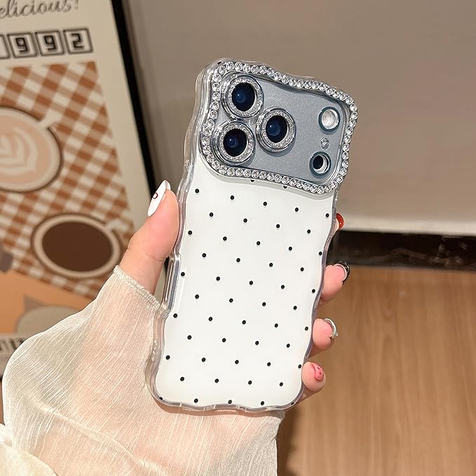iPhone17 Pro対応ケース、かわいいポルカドットデザイン、取り外し可能なダイヤモンドカメラレンズガラスプロテクター、6.3'' - 白