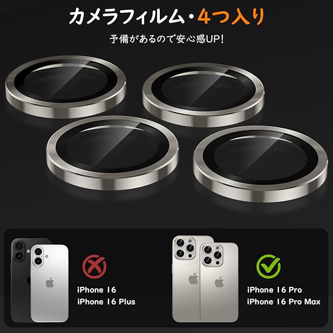 【4つ入り・予備があるので安心感UP!】iPhone 16 Pro/iPhone 16 Pro Max用カメラ保護カバーは、高品質なAB接着剤を使用しており、自動吸着と気泡防止機能を備えています。レンズに置くだけで、一発で完璧に貼り付けます。超強粘着力で、剥がれる心配もほとんどありません。更に、3枚セットで、張替の分も予備していますので安心感を大幅にアップ!