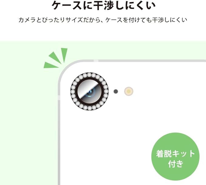 「PG-25KCLG11BK」は、華やかで可愛いラインストーンで装飾されたiPhone16e用 カメラレンズプロテクターです。透過率92%・表面硬度10Hのガラスと軽量なアルミニウムが一体成形されており、端末本体のカメラレンズをキズ付けず、美しくカメラレンズを守ります。着脱キット付きで貼り付け・取り外しも簡単です。貼り付け時に便利なクリーニングクロス・ほこり取りシール付き。