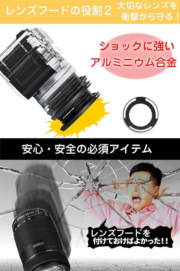 このレンズフードを装着することで、あなたのカメラレンズがカッコ良くドレスアップします。また金属製なので、プラスチックタイプのレンズフードより丈夫で機能的です。