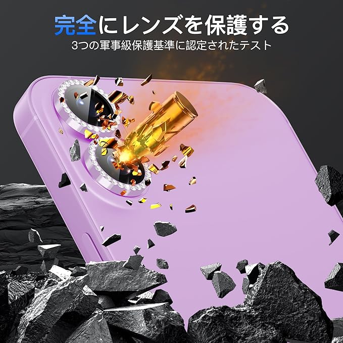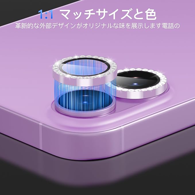 製品の特徴:For iPhone 17カメラレンズ保護カバー。ベゼルに光を屈折させるダイヤモンドをあしらい、光のある環境でキラキラと輝きます。レンズ部には9H強化ガラス膜を採用し、エッジのブラックコーティングにより雑光や派手な光がレンズに入るのを防ぎ、露出を抑えています