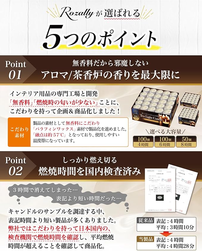 【心安らかな時間を作る】 Rozally ティーライトキャンドル ( ティーキャンドル ) がついに販売開始。 「アロマ用に無香料のキャンドルが欲しい」「茶香炉にハマって消費量が増えた」という お客様に人気の大容量の ティーライト キャンドル [アルミカップ] です。 「リラックスタイムで心安らかな時間を…」「儚げな炎の中で癒されたい…」 そんなお客様の声から生まれたティーライトキャンドルです。
