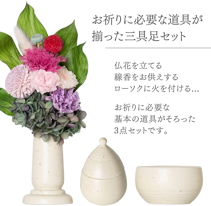 Ceramic Arte (セラミックアルテ) 仏具 白ミカゲ (花瓶&香炉&ロウソク立て火消しフタ付き)3点セット 日本製 小さめ ミニ仏具 陶器 仏壇 仏様 お花 お供え 蝋燭