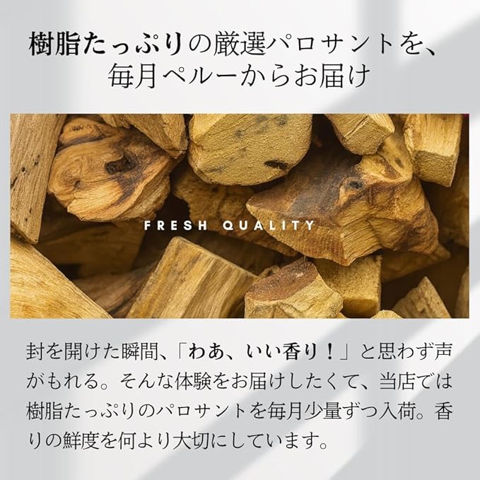 [当店のパロサントへのこだわり] 1. 最高品質のペルー産パロサントを絶滅危惧種にせずに育て、植林を行い、自然を守りながら10年以上経ったパロサントの木を使用しています。エシカルでサステナブルな方法でパロサントを提供し、自然と共存する取り組みを大切にしています。