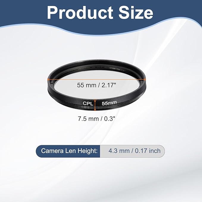 カラー:黒;素材:航空アルミニウム、光学ガラス;直径:55 mm / 2.17 インチ;カメラレンズの高さ:4.3 mm / 0.17 インチ;総高さ:7.5 mm / 0.3 インチ;梱包リスト:1個 x 円偏光フィルター