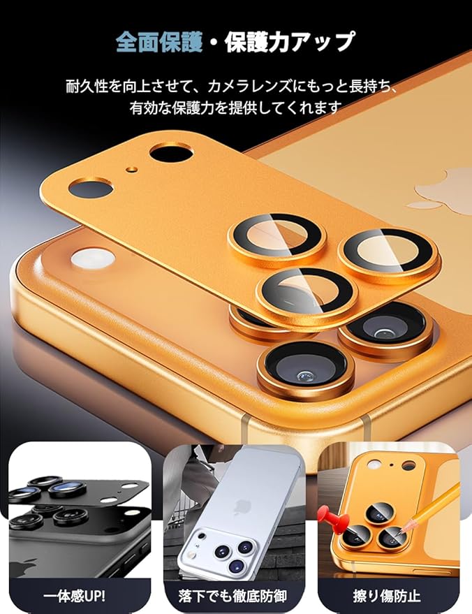 【4代目進化版・合金サンドブラスト加工】:本製品カメラカバーはスマホのカメラ部分の全体を覆われている一体型のデザインで,1つレンズの真ん中にAR98.5%透過率ガラスを採用されます。衝撃に強いチタニウムアルミ合金加工+9H高透過率強化ガラスの組み合わせて全面保護タイプは最高な保護力を提供しています。擦り傷や衝撃からカメラレンズをしっかりと守られます。