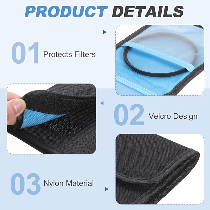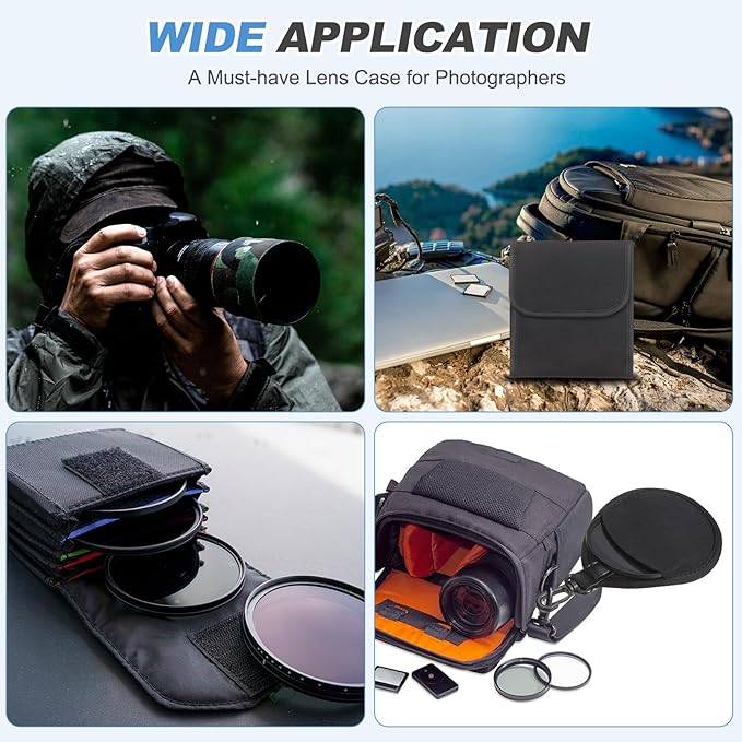 ナイロン素材とクッション材を使用したこのカメラフィルターポーチは、ほこり、湿気、衝撃からフィルターを保護し、常に良好な状態を維持します。