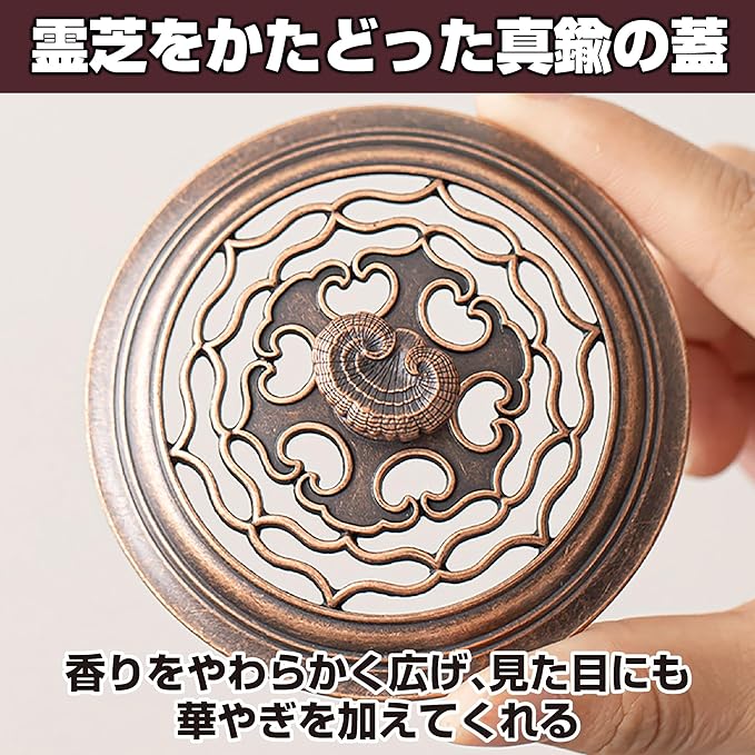 霊芝をかたどった真鍮の蓋:蓋は霊芝の形を模した造形で、真鍮による細やかな細工が施されています。霊芝は古くから縁起物として親しまれ、長寿や繁栄の象徴とされています。香りをやわらかく広げ、見た目にも華やぎを加えてくれます。