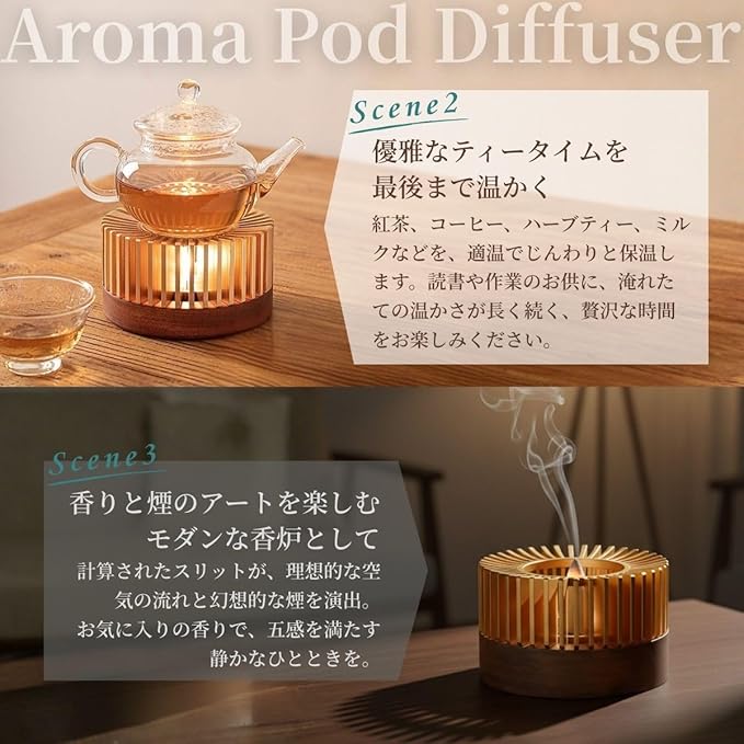【ウォールナット無垢材が魅せる北欧モダンデザイン】 深みのある色合いが美しいウォールナット無垢材を使用したアロマポット ディフューザーです。天然木ならではの温もりと上質な木目がリビングや寝室、書斎などの空間に自然と溶け込み、北欧モダンなインテリアとして洗練された存在感を放ちます。キャンドルの柔らかな灯りがやさしく広がり、視覚的な癒しとともに、忙しい日常の中に心落ち着くリラックスタイムを演出します。