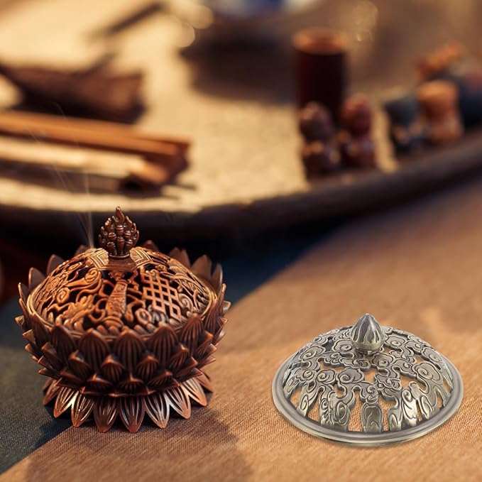 【煙が美しく立ち昇る透かし彫り】 繊細な**透かし彫り(オープンワーク)**のデザインが施された香炉用の蓋(カバー)です。蓋を閉めたままでも空気を取り込み、お香の煙が隙間から優雅に揺らめき出る様子を楽しめます。ヴィンテージ感あふれる幾何学模様が、和室にもモダンなリビングにも上品にマッチします。