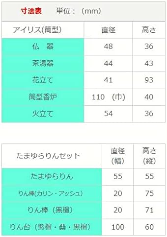 サイズ:・アイリス(筒型香炉) 仏器(幅48、高さ36)、茶湯器(幅44、高さ43)、花立(幅41、高さ93)、前香炉(幅110、高さ40)、火立て(幅54、高さ36)・たまゆらりん(直径55、高さ55)、りん棒カリン・アッシュ(幅20、高さ75)、りん棒黒檀(幅20、高さ71)、りん台(幅100、縦60)単位mm