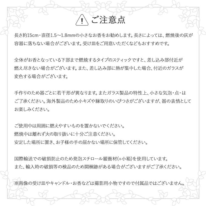 【ご注意点】長さ約15cm・直径1.5〜1.8mmの小さなお香をお勧めします。 お香が長すぎると、燃焼後の灰が容器に落ちない場合がございます。 手作りのため器ごとに若干形が異なります。 またガラス製品の特性上、小さな気泡・点はご了承ください。海外製品のため小キズや縁取りのいびつさがございますが、製品の表情としてお楽しみください。キャンドルやお香などは付属しておりません。