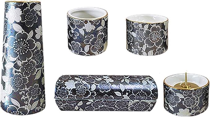 陶器製 モダン仏具5点セット『ゆい花』 (横置き筒型香炉) ブラックパール (j1272-1-2)