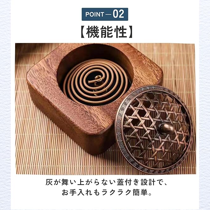 【リラックス効果】香りが広がると禅の境地に包まれ、心が和む癒しの空間を演出。【機能性】灰が舞い上がらない蓋付き設計で、お手入れもラクラク簡単。【安心設計】不燃シート内蔵で安全性も高く、渦巻き香やコーン香に対応。【使いやすさ】香を置くだけの簡単使用、初めての方でも気軽に楽しめます。