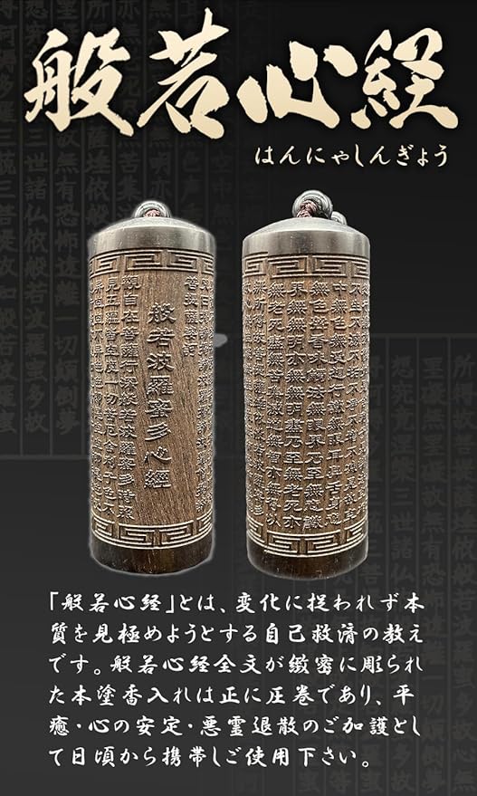 ✅【バリエーション:般若心経 (はんにゃしんぎょう)】 「般若心経」とは、変化に捉われず本質を見極めようとする自己救済の教えです。般若心経全文が緻密に彫られた本塗香入れは正に圧巻であり、平癒・心の安定・悪霊退散のご加護として日頃から携帯しご使用下さい。