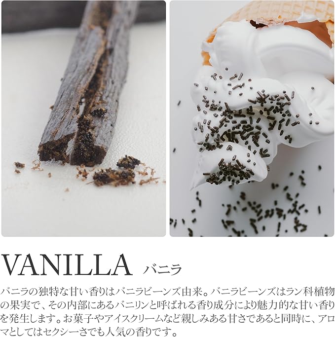 【お香の香り】バニラの独特な甘い香りはバニラビーンズ由来。バニラビーンズはラン科植物の果実で、その内部にあるバニリンと呼ばれる香り成分により魅力的な甘い香りを発生します。そこから抽出されたバニラエキスはアロマだけでなく、食品や香辛料、工業用途などにも使用され、多くの人々に親しまれています。