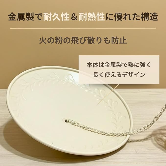 【高効率な虫よけ対策】 本体の側面には通気孔を配置し、煙がスムーズに広がる設計です。 線香がきちんと燃焼し、有効成分を含む煙を効率よく拡散。 庭・キャンプ・ベランダなど、広い空間でもしっかりと虫よけ効果を発揮します。 見た目の美しさと実用性を両立した高品質なデザインです。