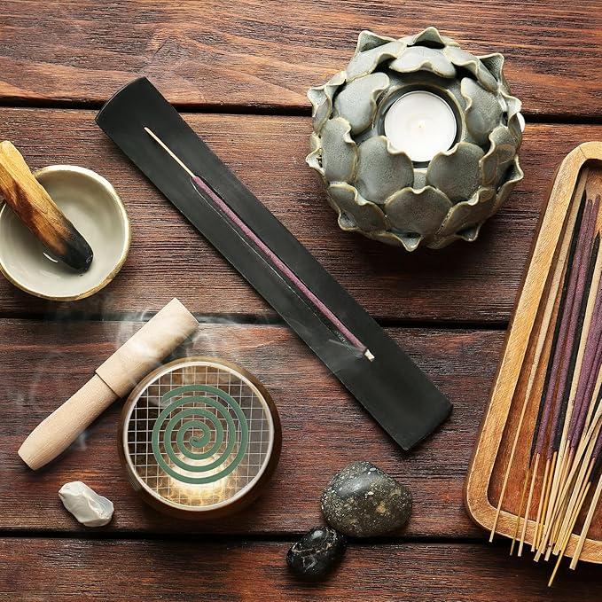 使い方:安定した耐熱面を選び、香炉パッドを平らに設置。お好みの塔香やコイル式お香に火をつけ、香炉パッドの上に置く