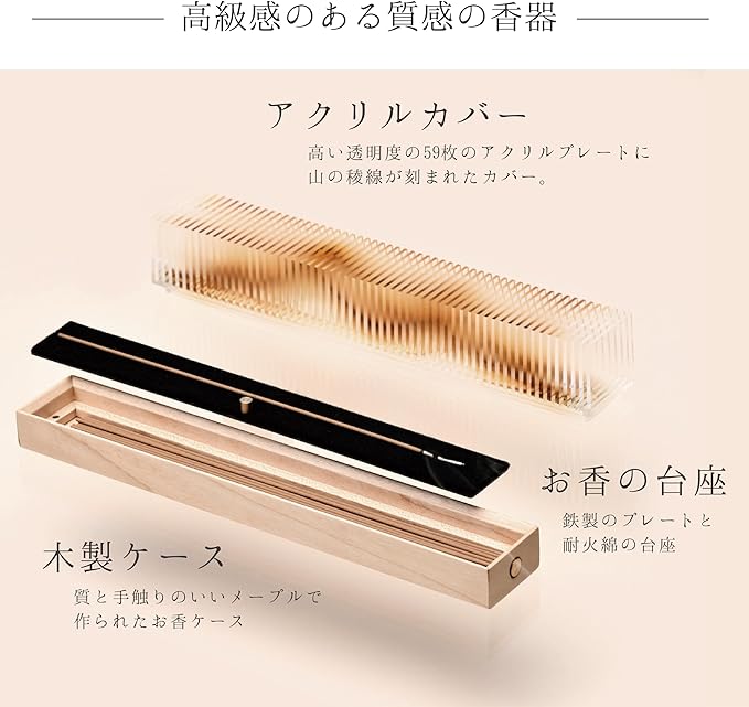 透明なアクリルケースとメープルウッドが織りなす、『過ごした時間を形にする』新しい香器。 使えば使うほど、連なるアクリル板が燻されて隠れた山が姿を見せる。香りも見た目も楽しめる、美麗で大人なデザインのお香立てです。