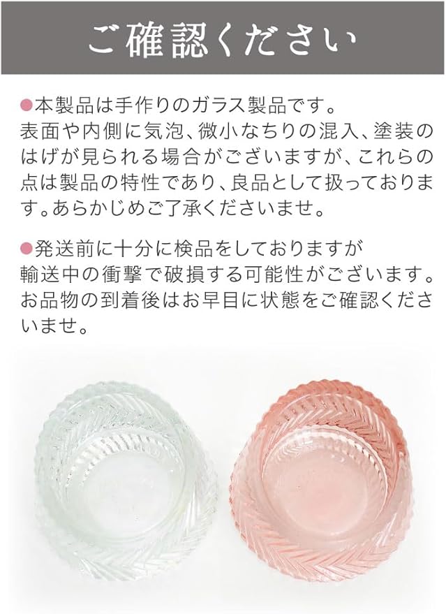 ※発送前に十分に検品をしておりますが輸送中の衝撃で破損する可能性がございます。お品物の到着後はお早目に状態をご確認くださいませ。 ※本製品は手作りのガラス製品です。表面や内側に気泡、微小なちりの混入、塗装のはげが見られる場合がございますが、これらの点は製品の特性であり、良品として扱っております。あらかじめご了承ください。