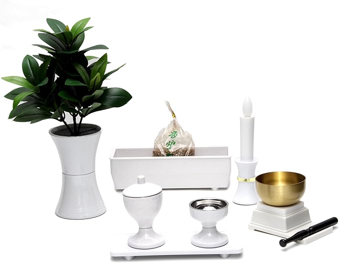 創価学会 ミニ仏壇専用 高音が心地よく響く 錆びないリン 水入れ ご飯 お盆 花瓶 しきみ 電気ろうそく 角香炉 灰付き 仏具 9点セット 白