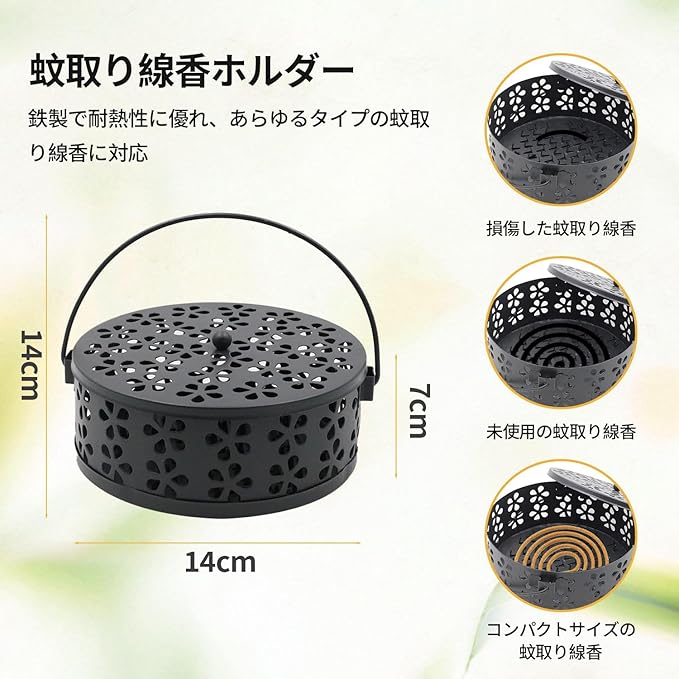【製品仕様】直径14cm、高さ7cm、内径14cmの丸型蚊取り線香ホルダー。花形の穴が通気性を良くし、スタンド不要で直接使用可能。