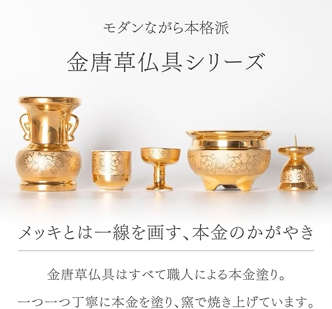 【お部屋に調和します】CERAMIC Arte(セラミックアルテ)は、仏具を四代にわたり製造してきた職人・デザイナーが、従来の仏具のデザインから離れ作った、現代の暮らしに合う新たなモダン仏具のブランド。この「金唐草仏具シリーズ」も、和室・洋室、重厚なお仏壇からモダンなお仏壇まで、様々なお祈りのスタイルに調和する仏具として作られました。