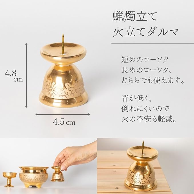 【仏花立て】仏様やご先祖様の御前にお花を飾る、仏花用花瓶です。3.5寸(直径7.5 高さ10.5cm)と使いやすいサイズです。 【香炉】▼香炉の中に香炉灰を入れ、お線香(お線香)を焚くのに使います。 【ローソク立て】▼ロウソクを立てるのに使います。金唐草仏具のロウソク立の芯針には、直径6mm 長さ50mm(燃焼時間 約15分〜18分)のロウソクをオススメいたします。