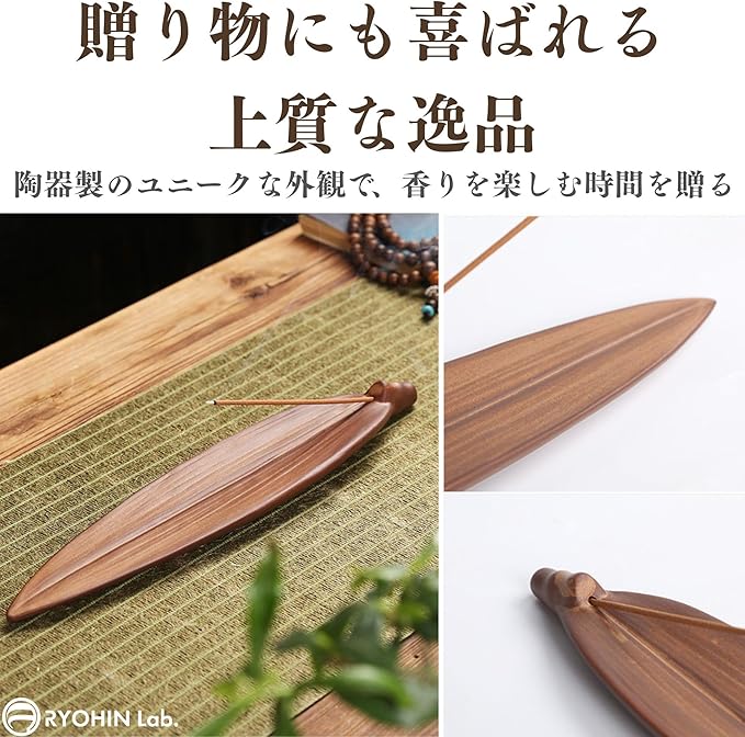 RYOHIN Lab.(良品ラボ) お香立て 灰がこぼれない 横置き 陶器 和風 船 アンティーク アロマ ストレート 線香立て 線香皿 お香置き インセンスホルダー 斜め 皿 和モダン インテリア雑貨 (竹の葉)