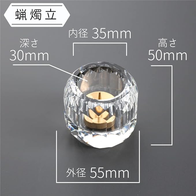 茶湯器:外径55mm(内径35mm)x高さ50mm、仏飯器:外径55mm(内径35mm)x高さ50mm、蝋燭立て:外径55mm(内径35mm)x高さ50mm