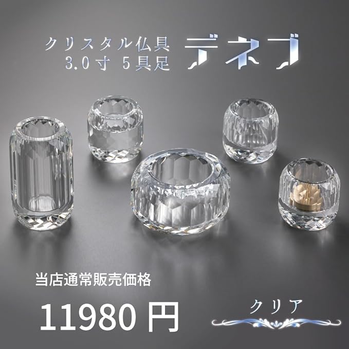 仏具セット ミニ デネブ 3.0寸 クリア クリスタル仏具 モダン仏具 5具足 おしゃれ(クリア) おしゃれ 香炉 花立 蝋燭立て 仏飯器 茶湯器