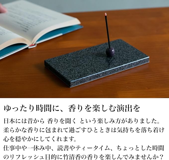 「香りを楽しむ」:日本には昔から 香りを聞く という楽しみ方がありました。柔らかな香りに包まれ て過ごすひとときは気持ちを落ち着け心を穏やかにしてくれます。 / +ご使用の際は香炉・香皿など不燃性の容器の上で焚き、火の取扱いには十分注意してください。 不安定な場所や、燃えやすい物の近くは避け、本来の目的以外には使用しないでください。 乳幼児の手の届かないところに保管してください。