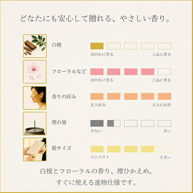 ■ 香りと品質の特長 ・創業90年の老舗による調香のハーモニー ・白檀とフローラル天然香料を調合したやさしい香り ・煙が少なく、お部屋の空気を汚しにくい設計