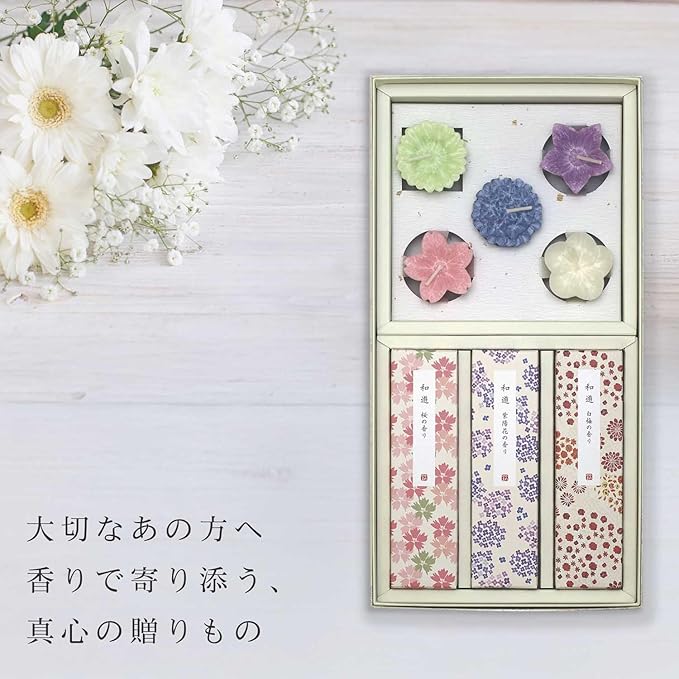 ■ 商品構成 ・和遊3種 各1箱 ・ロウソク(小箱入り) ・ギフト仕様の紙箱 ・線香の長さ:約13.5cm ・燃焼時間:約25分