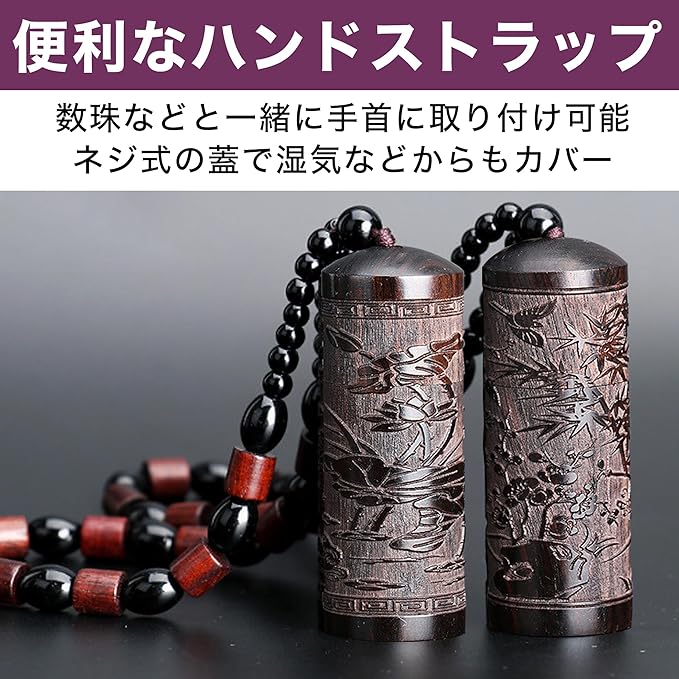 便利なハンドストラップで扱いやすい:数珠などと一緒に手首に取り付けることができるハンドストラップが付属しています。サッと取り出してご使用できます。ネジ式の蓋で湿気などからもカバーし、中に入れた塗香を長くお使いいただけますす。
