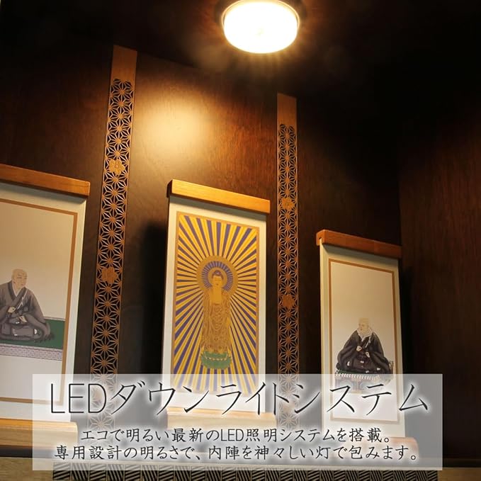 【LEDダウンライトシステム】エコで明るい最新のLED照明システムを搭載。専用設計の明るさで、内陣を神々しい灯で包みます。スイッチはライト本体に埋め込み、目立たず操作しやすい新設計。