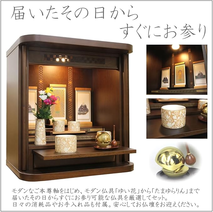 松山神仏具店 ミニ仏壇 モダン仏壇 ロール16号 おしゃれ 巻戸 まきど ウォールナット 日本製 国産 LEDライト 高48cm 幅44cm 奥33cm 全宗派対応 モダン仏具ゆい花(丸香炉) たまゆらりん 仏具一式セット 浄土宗