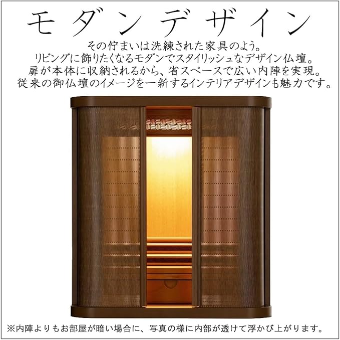【モダンスリムデザイン】その佇まいは洗練された家具のよう。リビングに飾りたくなるモダンでスタイリッシュなデザイン仏壇。扉が本体に収納されるから、省スペースで広い内陣を実現。従来の御仏壇のイメージを一新するインテリアデザインも魅力です。