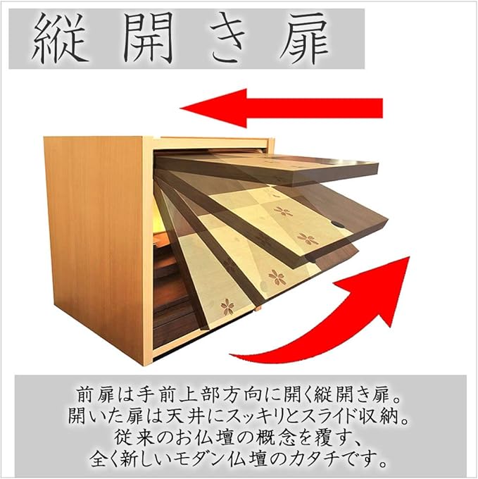 【縦開き扉】前扉は手前上部方向に開く縦開き扉。開いた扉は天井にスッキリとスライド収納。従来のお仏壇の概念を覆す、全く新しいモダン仏壇のカタチです。