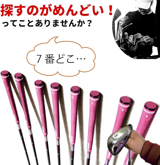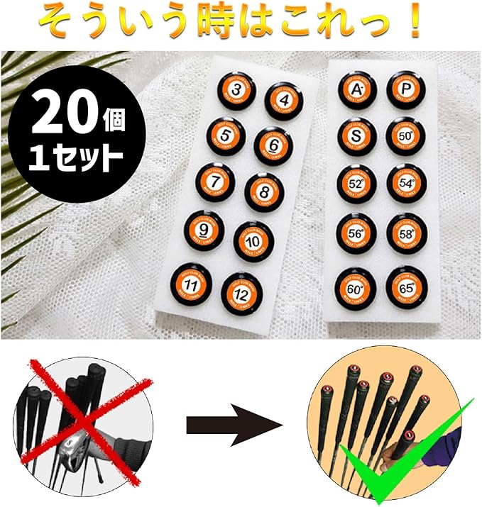 アイアン探しで困ったことはありませんか?そういう時にとても役立つアイアン番手マーカーです♪ フェアウェイやユーティリティにももちろんお使いいただけます! 取付簡単で取り外しも簡単に出来て使いまわしが出来る便利アイテム♪ グリップ穴に取り付ければ、防水・腐食防止にもなるグッドアイテムです♪