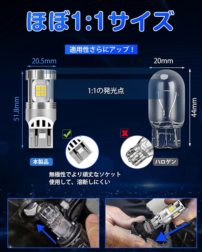 【無極性&取付簡単】スパリー t20 led バックライトはハロゲンデザインと同じサイズで、端子は無極性なので、+ 、-の極性に注意する必要がなく、どんな電極でも点灯もできます。手間がかからなくて、初心者でもポン付けで簡単交換出来ます